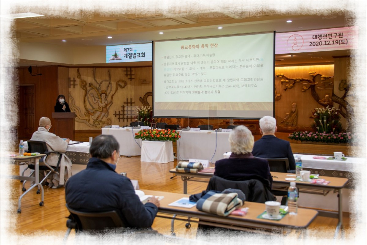혜선스님(대행선연구원 연구실장): “첫 번째 발표는 불교음악원 원장이시며 동국대 문화예술대학원 석좌교수, 전 중앙대 총장이신 박범훈 원장님이 좌장을 맡아 주시겠습니다.”