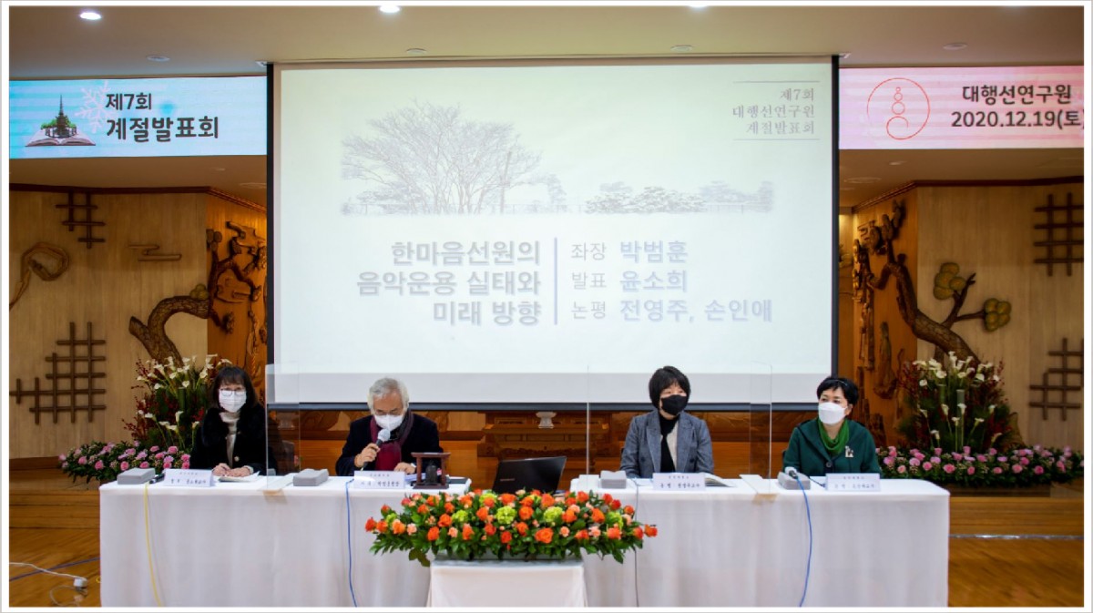 박범훈 원장(불교음악원 원장) : “‘한마음선원의 음악운용 실태와 미래 방향’에 대해서 윤소희 교수님께서 발표를 해주시겠습니다.”
