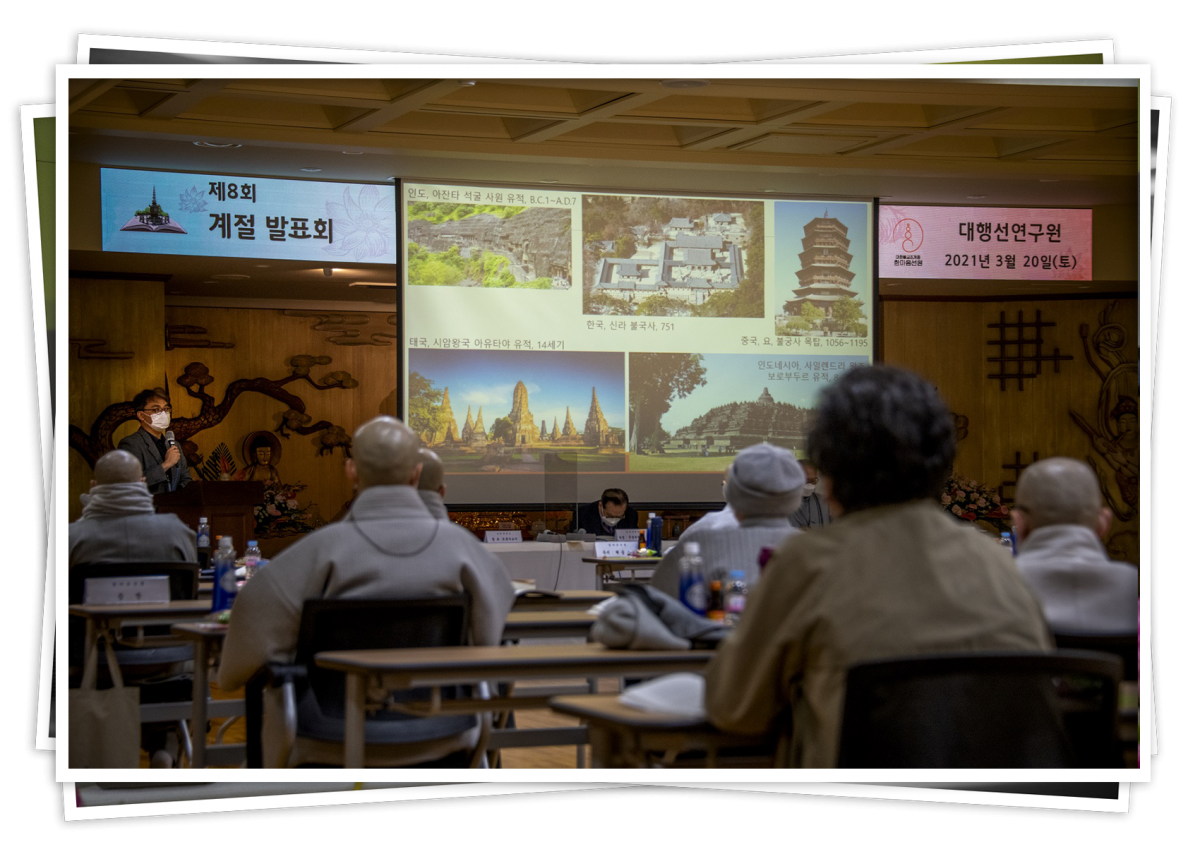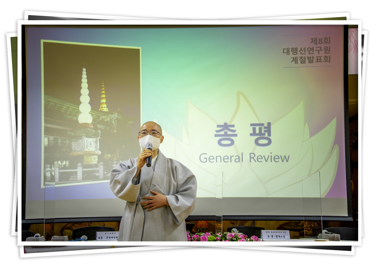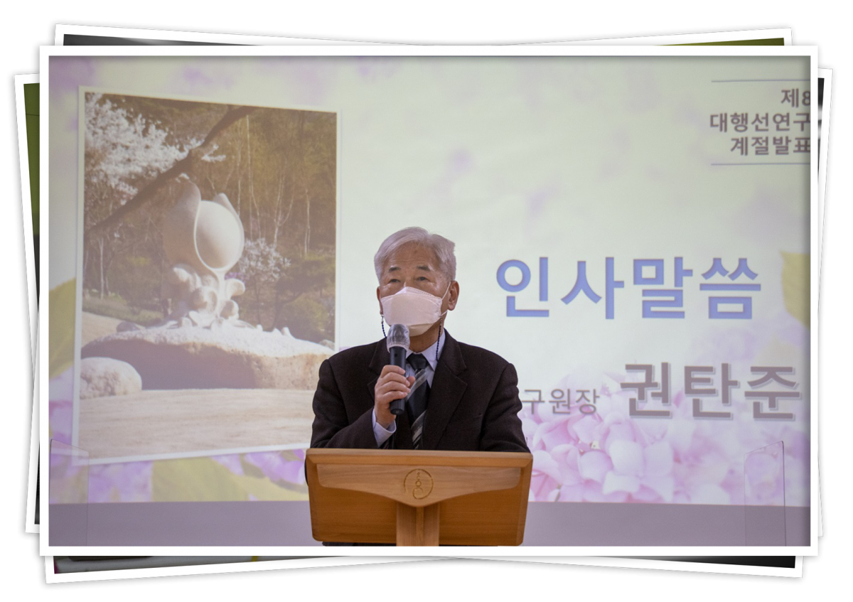 “대행선연구원 8번째 계절발표회 자리입니다. 그 어느 때보다 사실 저 역시도 많은 생각들이 오고가는 시간들이었습니다. 지금까지 발표된 논문들은 사상적으로 밝히고 드러내는 부분이었는데 … 이번 발표회는 일상 수행에서 거울이 되어주는 우주탑과 구정탑이 주제로 논해지기 때문에 아무래도 직제자인 저희들은 그동안 은사스님께서 남기신 말씀들 가르침을 되새겨보는 자리여서 더 많은 생각들이 오고가지 않았나 생각해 봅니다.”